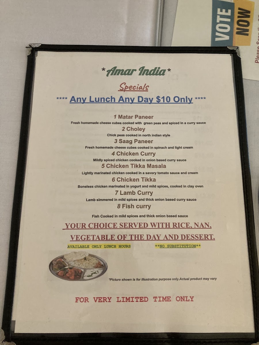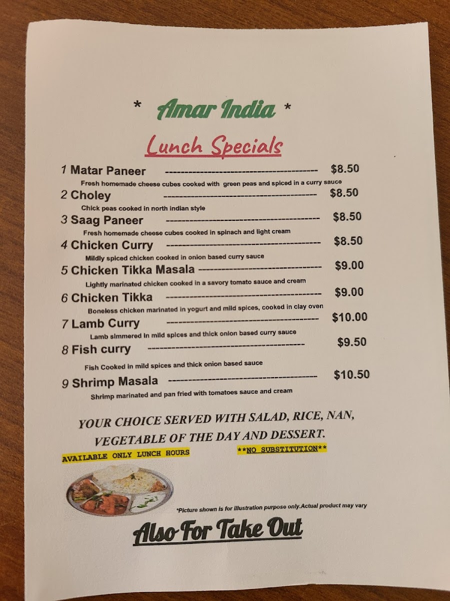 Welcome to Amar India Restaurant, a culinary gem nestled in Dayton, Ohio. Celebrated for its authentic Indian cuisine, Amar India offers a delightful menu that features rich flavors and aromatic spices. Customers rave about standout dishes like paneer tikka masala, potato vindaloo, and the ever-popular dal. The paneer naan is a must-try, creating a perfect harmony with any meal.